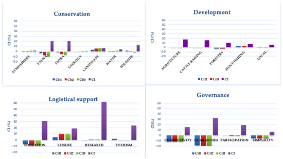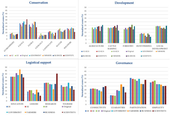 Conflicts regarding the global solution are shown in Table 2. The highest conflicts were related to management objectives education (0.962) and research (0.817) (Logistical support), guarantees (0.320) (governance), and fauna (0.207) and flora (0.207) (conservation). The highest conflicts regarding development management objectives were identified for agriculture (0.176) and cattle raising (0.155) but this dimension showed conflict index values lower than in other dimensions.