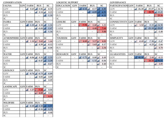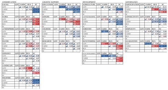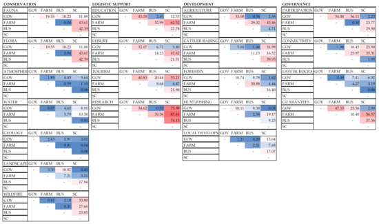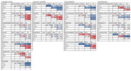Intergroup pairwise conflicts analysis (Figure 4) identified the highest levels of conflicts in the domain of conservation for fauna and flora to occur between government and the other groups and between scientists and farmers and businesspersons, and for wildfire between scientists and the other groups. Regarding logistical support, for education and research scientists and farmers were the most conflictive groups. For agriculture and cattle raising (development), the most conflictive groups were scientists and farmers once again. Finally, in the governance domain, guarantees was the most conflictive MO between all the groups, and participation was the most conflictive between farmers and businesspersons and government. Farmers had also some conflicts with businesspersons and scientists regarding connectivity.