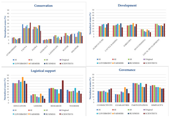 The most consensual solution suggests prioritizing Fauna and Flora objectives within the conservation dimension, education within logistical support, local development and agriculture within development, and participation within governance. Regarding the MO in governance, the model provided an acceptable solution in the first iteration. However, the most conflictive criteria (guarantees) assessed the minimum tolerable value. When the bounded parameters were relaxed, the assessment of guarantees decreased. That means that this MO could be problematic and maybe this score should be negotiated with simplicity which changes more significantly with the iterations. In this case, the ranking was stable in all the iterations and levels.