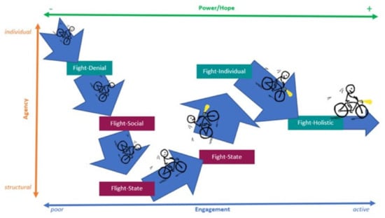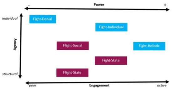 The arrangement of responses represents a progression from poor engagement in the CCE programme (with little expectation of effecting change) (Fight-Denial) to active engagement and a strong measure of power to combine personal and structural efforts to resolve the climate crisis (Fight-Holistic). This echoes work by Bostrom et al. [25]. They argue that individuals’ views of their own capacity to mitigate climate change, and the efficacy of government or collective actions in mitigating it, are linked to individuals’ concern over climate change. As they succinctly write (p. 818), ‘policy support [to mitigate climate change] increases directly with increases in government collective response efficacy, as well as with increases in personal-self efficacy’. Thus Figure 1 shows increased power to enact change as linked to active engagement with climate change. Locating the Fight-Holistic response centrally between individual and structural agency highlights the connection between an individual’s understanding of their own self-efficacy and the importance of perceptible governmental action to combat climate change [4].