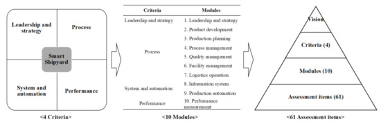 The smart factory assessment module is a diagnostic tool suitable for the general machinery sector and is actively used by South Korean manufacturing companies [22]. Accordingly, this study also attempted to assess South Korea’s large and medium-sized shipbuilding companies using this smart factory assessment tool in the initial stage. However, the composition and contents of the assessment items defined in the existing model did not reflect the characteristics of the shipbuilding industry and differed from the shipbuilding production system, thus, degrading the reliability of the assessment results.