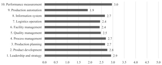 Figure 4 shows the average score for each module of the companies investigated. Production automation, the most noteworthy module, showed the lowest assessment at 1.9 (approximately 40 points based on 100 points) owing to the high dependence on workforce in the shipbuilding industry. Most shipyard and subcontractor processes are manual processes. All construction can be performed manually, excluding processing and some assembly processes in large and mid-sized shipyards. Considering the weight of the number of hours by process, large shipyards also have very low automation rates, at approximately 30% for processing and 10% for assembly.
