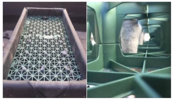 The test modules were constructed with a footprint of 0.72 m2 (1.2 m × 0.6 m) each and simulate higher slopes associated with typical flat roofs (4%). The dimensions of the testbeds were designed to support a drainage reservoir underneath that has the storage capacity of 50 L; otherwise considered as the equivalent to 67 mm of runoff from rain events. Each of the testbeds utilize GR-growing media that follow the FLL guidelines, including a porosity of 60% and an averaged density of 850 kg/m3 [17]. This was to establish evapotranspiration and retention rates that can be correlated to multiple GR systems that are currently being sold in the marketplace.