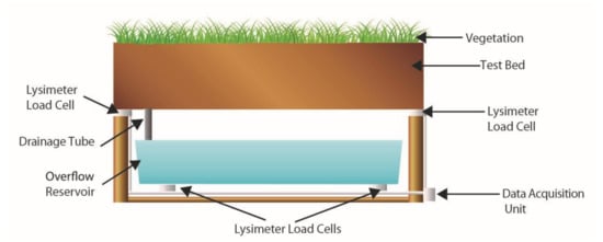External drainage reservoirs for each of the modules collect the water that flows out of the system, as shown in Figure 4. To establish the retention capacities of the test modules and the associated ET rates, a lysimeter was implemented. Digital load cells were utilized under the four corners of the bed to measure weight to obtain the mass transfer of water in the modules; there were also 3 loads cells measuring the weight of the drainage reservoir in order to determine how much rainfall was not retained in the module. Between these seven sensors the water flow in and out of the modules can be obtained, isolating ET as differences in mass transfer. The data from the load cells were obtained by a Pi Zero microcomputer, combined with an 8-channel multiplexer to provide communication for all cells on the same i2c bus [40]. To mitigate the risks of water damage, all electronics were contained within a PVC conduit assembly. The lysimeter system with the testbed assembly is shown in Figure 4.