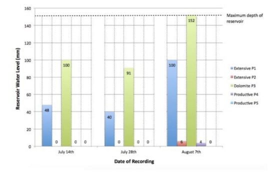 Figure 5 shows the amount of overflow measured in each of the drainage reservoirs after three successive rainfall events. The water levels were measured in mm in the translucent containers, and the reservoirs were emptied after each measurement. As can be seen, the extensive module P1 and the BR aggregate module P3 show stormwater runoff, with other modules having no runoff at all after the first two (moderate) rainfall events. The 7th of August reflects a rare rain event with massive thunderstorms occurring in the two days prior to the visit to the rooftop. Upon inspection, the drainage reservoir under the P3 module was filled to the rim, with the lid floating on top—as the container had been forced open. Ultimately, the only number that can be used to reflect this overflow is the height of the bin, 152 mm, though it was abundantly clear that much more rainfall than this had passed through the non-GR dolomite module P3. After this heavy storm event, productive module P5 still had zero runoff.