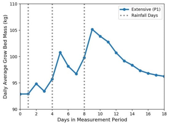 Lysimeter loading data from September, 2020 are presented in Figure 6 across daily intervals for the P1 extensive plot; the net mass includes gains from rainfall and losses from ET. From this daily average dataset it can be observed, for example, that after rainfall on day 9 ET slowly declined as a function of reduced available moisture content in the growing media as expected. From these data, the ET rate of the P1 module averaged 2.27 mm/day, with a maximum of 4.42 mm measured on September 15th, as reported previously by our team [40].