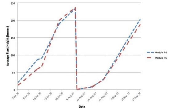 Height of vegetable plant in productive modules P4 and P5 over two harvest cycles.
