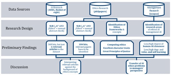 In traditional business and manufacturing contexts, unethical behaviors mostly occur by “design” (e.g., the Dieselgate of Volkswagen or the sub-sub-contracting of parcel delivery services to circumvent labor laws and save costs). Managers are or can easily be aware of potential consequences that their decisions may have. Unethical behaviors, thus, seldomly happen by mere “chance.” In the AI context, however, such unethical behaviors may occur not only by “design,” but also as an unintentional consequence and, thus, by mere “chance” or “external causes” [27]. For instance, the Tay chatbot released by Microsoft in 2016 became racist after being trained by users on Twitter, but had not been intended or designed to become offensive [28]. For organizations, this raises the question of which ethical principles should be used to develop and manage AI-based technologies. In research, one aspect which is gaining more and more attention is the prediction of an industry 5.0 [29]. Unlike industry 4.0, where the focus is on automation, industry 5.0 is about the synergy of humans and robots. In essence, robots and humans are collaborators instead of competitors [29]. Hence, the focus of industries can be expected to shift away from technical development of systems and towards the social needs of people [29]. However, there is a lack of guidelines and frameworks on how to make AI manageable. In order to gather an overview of research on the intersection of ethics, AI, and management, we conducted a comprehensive literature search in the beginning of 2020 to identify existing conference and journal publications within common databases (AISeL and Scopus databases). In order to be able to map the ethics research perspectives more clearly, we also researched a comprehensive philosophical database (Philpapers.org database). We used the search term “AI AND (Ethics OR Ethical)”, resulting in 552 hits and a sample of 192 papers after filtering (see Figure 1).