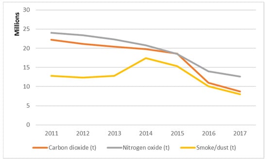 In 2008, China’s State Environmental Protection Administration was upgraded to the Ministry of Environmental Protection, which became a component of the State Council, and was reorganized as the Ministry of Ecology and Environment in 2018. Through vertical management and political empowerment, China’s environmental protection agencies are more capable of supervising and punishing the pollution problems of enterprises. According to the study of Chen et al. [1], China’s vegetation growth rate accounted for 25% of global growth from 2000 to 2017, ranking first in the world. In addition, according to the data of the National Bureau of Statistics, the emission of major pollutants in China’s exhaust gas decreased significantly from 2011 to 2017, as shown in Figure 1. China has made remarkable achievements in theoretical guidance, government efforts, and responsibility implementation.
