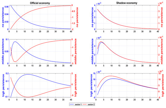 The analysis illustrated in Figure 1 describes the effects of shocks of the size of one standard deviation on the dynamics of both economic sectors, i.e., the sector burdened with environmental taxation and the sector not burdened with it. The performed analysis included a total of four variants from the perspective of the sectors examined—the sector of commodities not burdened with environmental taxation (Sector 1) in the official economy and the same sector in the shadow economy. The part of the economy that includes commodities burdened with environmental taxation (Sector 2) was examined in the same way. All four variants were then analysed for three types of corruption. These were sporadic corruption, inertial corruption and the so-called State Capture, which is a situation close to systemic and immanent corruption. The simulations were therefore performed to set the shock persistence of corruption perception indicator, , at 0 (no persistence), 0.5 (middle persistence) and 0.9 (high persistence). The following table summarizes the twelve options. The horizontal axis indicates the time periods divided into quarters.