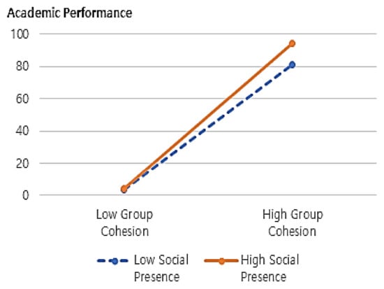 Hypothesis 3 assumed an interaction effect between social presence and group cohesion in academic performance within the hypothetical learning group. The mixed model test supported the interaction effect (β = 1.967, p < 0.05). Figure 3 shows two-way interactions related to Hypothesis 3. The group with high and low values for the two variables was classified based on the average values of group cohesion and social presence. The effect on academic performance was analyzed. Figure 3 clearly shows the positive relationship between group cohesion and academic performance when recognizing high levels of social presence within a virtual learning group. In particular, it can be seen that the slope of the function in which group cohesion affects academic performance is steeper than that in groups with lower social presence.