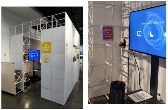 We design and build an immersive real space where participants can interact with the feedback interface we developed and designed (similar in logic to what was previously used in testing occupants’ actions, e.g., [25]). It consists of a room of approximately 1.5 by 2.5 m, modelled as a living room, and with only one entrance. We added an opaque black cover to the room’s ceiling to minimize the penetration of direct light. Since the room was located in a university exhibition space, we did not invite participants. Instead, we presented the exhibition visitors with a series of colourful posters and a large active screen so that they would feel compelled to enter the space and play (seen in Figure 1). The experimental room was equipped with 3 types of indoor environment devices relating to 3 different indoor environment parameters, which would have to be controlled by the participants (these were real physical devices):