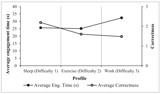 The Kruskal–Wallis test revealed no significant difference (at p < 0.05) between the engagement time and hints across the three profiles. We can conclude that the level of difficulty of the profile did not significantly affect participants’ on those variables, furthering supporting the fact that the participants did not know the complexity of the profile they selected.