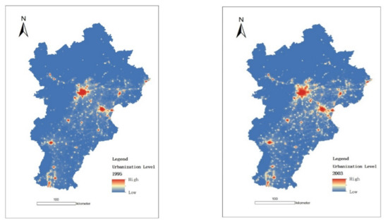 With reference to the work of [38], corrected lighting data were retrieved at the county-level scale using the urbanization-level estimation model. Slope analysis was used to establish the spatiotemporal evolution and the growth rate characteristics of the urbanization level at the county level for the BTH region from 1995 to 2018 to provide a reference to assess the BTH urbanization policy.