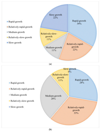 As shown in Figure 11, The rapid-growth regions are concentrated in the city centers of Beijing, Tianjin City, and certain prefecture-level cities in the Hebei Province (Yuhua District in Shijiazhuang City, Lunan District in Tangshan City, Beidaihe District in Qinhuangdao City, Congtai District in Handan City, and Nancheng District in Baoding City). In general, the urbanization level of most counties in the Hebei Province grew only slowly. Figure 12 shows the proportion of counties corresponding to each growth level.