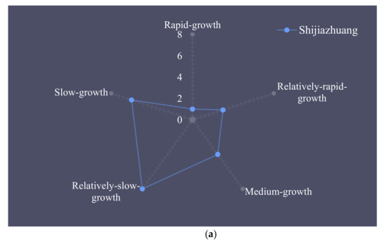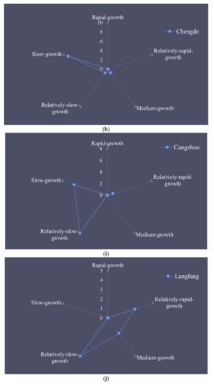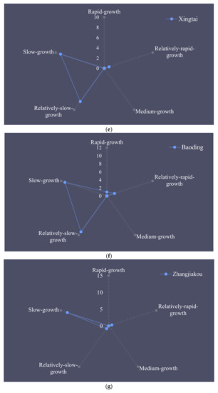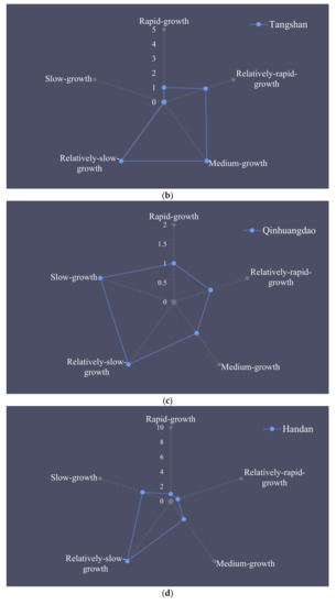 For Tangshan City and Langfang City, the number of counties was concentrated in relatively rapid growth, medium growth, and relatively slow growth, and the quantity gap among these was small, indicating that their urbanization development was relatively balanced.