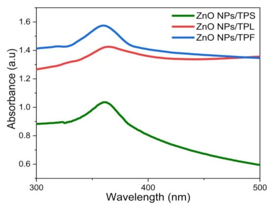 UV–Vis spectroscopy was used as the preliminary identification method for the formation of ZnO NPs and to characterize optical properties [8,10,23,39]. For this process, pale white NPs obtained from each part of the plant (i.e., TPL, TPS, and TPF) were suspended in DI H2O, and spectrum scans were performed in the range of 200–800 nm. As shown in Figure 1, the optimum λmax values corresponding to the absorption peaks of ZnO NPs/TPL, ZnO NPs/TPS, and ZnO NPs/TPF were observed at 370 nm, 367 nm, and 363 nm, respectively. Previous studies showed that the absorption spectra of ZnO NPs generally depend on the parameters, such as size, shape, and temperature [6,10,23,46]. With the decrease in average particle size (PS), their resonance absorption peak showed a hypsochromic shift and vice versa [2,6]. In this study, the sharp hypsochromic-shifted absorption peaks obtained confirmed the formation of nanoscale ZnO.