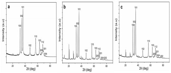 XRD patterns of biosynthesized ZnO NPs. (a) ZnO NPs/TPL; (b) ZnO NPs/stems (TPS); (c) ZnO NPs/ inflorescences (TPF).