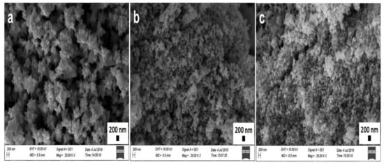 SEM micrographs of ZnO NPs (magnification: 25×, scale bar: 200 nm). (a) ZnO NPs/TPL; (b) ZnO NPs/TPS; (c) ZnO NPs/TPF.
