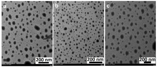 TEM images of ZnO NPs (magnification: 20×, scale bar: 200 nm). (a) ZnO NPs/TPL; (b) ZnO NPs/TPS; (c) ZnO NPs/TPF.