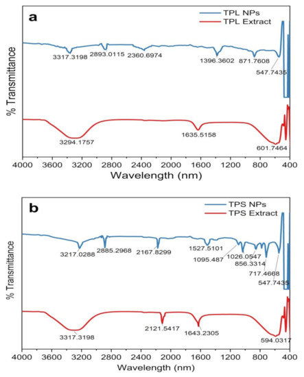 ZnO NPs/TPS and ZnO NPs/TPF showed miniature peaks in the ranges of 1500–1650 cm−1, 1000–1200 cm−1, 1000–1100 cm−1, and 650–750 cm−1, corresponding to the symmetric stretching of the carbonyl side groups in the amino acid residues of the protein molecules, the CN stretch of aliphatic amines, alkanes, and supposedly, the CH bend in alkynes, respectively. The peak at 1350–1400 cm−1 is assigned to CH bending in the −CH2 group found only in ZnO NPs/TPF. The IR bands rationalize that the aqueous extract of T. purpurea is rich in phenolic compounds, saponins, flavonoids, amide, tannins, alkaloids, and amines. Thus, the involvement of these secondary metabolites as capping agents induced NP stabilization, thus aiding the formation of ZnO NPs [8,23,48,49].