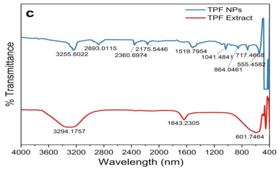 FTIR spectrogram of plant parts and synthesized ZnO NPs. (a) ZnO NPs/TPL; (b) ZnO NPs/TPS; (c) ZnO NPs/TPF.