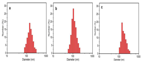 The variation in PS could be attributed to the polydisperse nature of NPs. The PDI represents the degree of ‘‘non-uniformity” of the distribution and is related to the existence of NPs as aggregates or agglomerates, causing variability in the calculated PS in comparison with the theoretical size [23]. DLS is an emerging non-invasive technique that is extensively used to determine the PS and the PS distribution of NPs. The PS was calculated by the hydrodynamic diameter based on Brownian movements exhibited by the particles. The average hydrodynamic diameter was in the range of 85–150 nm, which is quite larger than the theoretical size reported by XRD and TEM (Figure 6). The average PS was found to be 140.19 nm (PDI = 0.213) in ZnO NPs/TPL, 147.63 nm (PDI = 0.192) in ZnO NPs/TPS, and 141.62 nm (PDI = 0.2) in ZnO NPs/TPF.