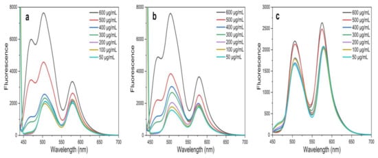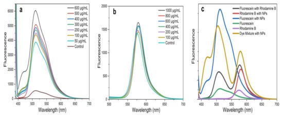 The FRET ability exerted by the ZnO NPs in the presence of fluorescein (Flu) and rhodamine B (RhB) dyes was evaluated by fluorescence spectrometry. A concentration series of 50 μg mL−1 to 600 μg mL−1 in MeOH was prepared for ZnO NPs synthesized from all three plant parts. A Flu solution () and a RhB solution () were prepared in MeOH, and equal volumes (400 µL each) of Flu and RhB were mixed with 1000 µL of ZnO NPs, making the final volume 1800 µL. The treated solutions were mixed by vortexing, and then the fluorescence spectra were recorded, while the emission wavelengths were scanned from 450 nm to 700 nm at a fixed excitation of 430 nm.