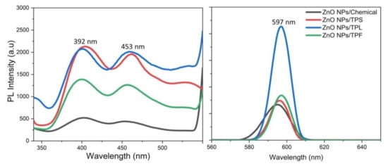Figure 9 illustrates the RT-PL emission spectrum of ZnO NPs/TPL, ZnO NPs/TPS, and ZnO NPs/TPF in comparison with chemically synthesized ZnO NPs, at the excitation wavelength of 295 nm. Previous studies revealed that PL emission depends on the excitation wavelength [11,57]. Interestingly, our data revealed that the maximum PL intensity can be achieved only when the excitation wavelength is at 295 nm and a wavelength above or below this value causes changes in the position of the peaks. Indeed, at this excitation, all the ZnO samples exhibited band edge emission at 392 nm in the UV region and deep trap state emission related to blue emission at 453 nm and yellow emission at 597 nm in the visible region (Figure 10). Generally, the less intense and broad peaks found at 392 nm are attributed to the free recombination of excitons that originated from the localized level slightly below the conduction band to the valence band, due to the electron transition [3,12,58]. Besides, peaks that appeared at around 453 nm were related to intrinsic surface defects of ZnO nanostructures originating from the zinc interstitials and/or oxygen vacancies and may have been due to singly ionized chargers located at ~0.21 eV above the valence band [3,20,58]. Studies reported that the apparition of electron capture on the surfaces of NPs causes quenching of blue emission [12]. However, the detailed mechanism for blue emission at 453 nm has not yet been explored.