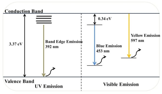 The optoelectronic properties of semiconductor NPs like ZnO NPs have gained tremendous interest in recent years, and the photoconductivity of these NPs arises due to the photogeneration of electron–hole pairs after the absorption of photons [13]. Besides, ZnO NP properties are strongly affected by extrinsic and intrinsic defects and impurities [3,13]. PL spectroscopy was used to identify the efficiency of the charge carrier separation and point defects in ZnO NPs, such as oxygen vacancies (Vo), oxygen interstitials (Oi), zinc vacancies (VZn), zinc interstitials (Zni), and oxygen antisites in ZnO NPs [3,13].