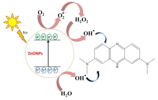 The simplest mechanism of MB photodegradation in the presence of phytosynthesized ZnO NPs has been clarified in this study (Figure 11). Thereby, under irradiation, photo-induced molecular reactions take place at the surface of the nanocatalyst. ZnO NPs absorbed photon energy equal to or higher than the bandgap energy to create holes (h+) in the valence band and the electrons (e−) in the conduction band. The free holes oxidized neighboring H2O molecules into hydroxyl radicals (•OH), while the electron in the conduction band lessened the O2 adsorption by converting O2 into superoxide radicals (O2•−). These species act as strong oxidizing agents that are highly reactive and oxidize MB to CO2, H2O, and inorganic acids [5,9,40].