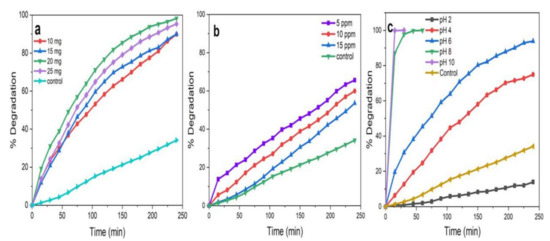 Figure 12a displays the degradation of MB dye by keeping the concentration of MB constant (5 ppm) and varying the catalytic load (10, 15, 20, and 25 mg) at pH 6. It was revealed that with the increase in catalytic load from 10 to 20 mg, the rate of dye degradation increased by 9%. This is because the availability of active sites of the photocatalyst increased on the surface, making them easily participate in photoactivity [2,9,40]. However, the further increment of photocatalyst concentration (>20 mg), caused the aggregation of NPs, resulting in a decrease in the number of surface active sites and specific surface area. Further, this affected the penetration of light through the medium, leading to poor opacity and scattering of light, resulting in poor degradation [9,10]. Therefore, the catalytic load of 20 mg of the reaction mixture was considered for further studies.