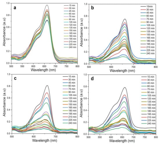 By using the above-mentioned optimized conditions (20 mg catalyst, 5 ppm MB, and pH 6), the photocatalytic degradation of MB was tested for 240 min under direct sunlight for the mixture without ZnO NPs (control) (Figure 13a), ZnO NPs/TPL (Figure 13b), ZnO NPs/TPS (Figure 13c), ZnO NPs/TPF (Figure 13d). UV–Vis absorbance spectra of the MB treated with any of the biogenic ZnO NPs under sunlight, demonstrated a significant and time-dependent degradation of the MB compared to the control. Moreover, it could be observed that the absorption intensity decreased with time considerably, within the first 30 min in samples, compared to the control.