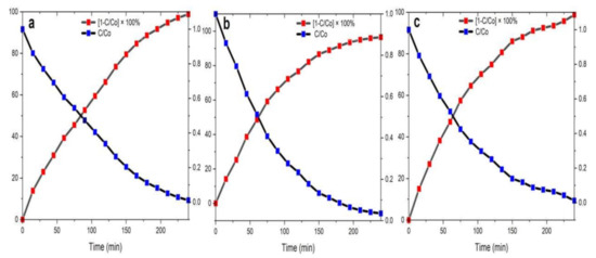 The half-life of the MB dye degradation by biosynthesized NPs was taken at the crossover point of curves C/Co and [1 − C/Co] × 100% (Figure 14). Degradation efficiency for ZnO NPs/TPL (Figure 14a), ZnO NPs/TPS (Figure 14b), ZnO NPs/TPF (Figure 14c) was measured for the duration of 240 min, and the plots were generated for calculating the half-life and degradation efficiencies.