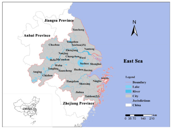 The Yangtze River Delta Urban Agglomeration (YRDUA), located on the largest alluvial plain in Eastern China (29°20′ W−32°34′ W, 115°46′ E−123°25′ E; Figure 1), was proposed in the Development Plan of the YRDUA (2016–2030) and approved by the China State Council in 2016. This region covers a land area of 211,700 km2, of which 49.4% is mountainous (the southwestern part), and the rest are plains (the northern, central, and eastern areas). The YRDUA encompasses 26 cities, including the Shanghai Municipality, nine cities in southern Jiangsu Province, eight cities in northern Zhejiang Province, and eight cities in parts of Anhui Province. Characterized by a subtropical monsoon climate, the annual mean temperature and precipitation there range from 18 to 23 °C and from 1000 to 2000 mm, respectively.