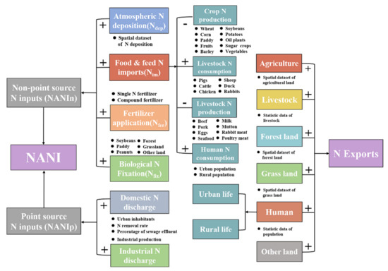 Revealing the spatiotemporal patterns of N budgets can provide effective information for improving nitrogen pollution management and can point to the dominant sources of pollution for potential reduction strategies [24]. The net anthropogenic nitrogen input (NANI) model, first introduced by Howarth et al. [25], has been widely used to estimate the anthropogenic N inputs in various regions across the world, and has been shown to be a simple and effective mass balance approach that is detailed enough to incorporate available data on individual crops, livestock, and people [6,12,13,22,23,24,26,27,28,29,30,31,32]. This method is typically calculated as the sum of four major components: fertilizer N application, N in net food and feed imports, atmospheric N deposition, and biological N fixation. Considering the modes of delivery of N, Zhang et al. [28] divided the N inputs into non-point-source and point-source, providing a more accurate estimate of nutrient inputs, especially in areas with heavy point-source N pollution.