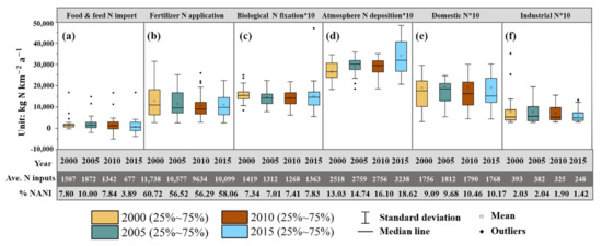 Additionally, the amount of net food and feed N import increased from 2000 to 2005, and then decreased by 2015, showing that the mismatch between food supply and demand in the YRDUA intensified between 2000 and 2005 and then improved from 2005 to 2015. In contrast, the N contents from biological N fixation and industrial N production were relatively stable. The variation rates of N input sources over the study period are shown in Figure 5. During 2000–2005, four out of six components of the NANI increased. However, in 2005–2015, there was only one increase; in other words, except for the atmosphere N deposition, the others showed a downward trend. Thus, we concluded that, in addition to the fertilizer N application, which is generally the main source of N inputs, atmospheric N deposition, which mainly results from fossil fuel combustion, traffic emissions, industrial exhaust emissions, etc., also requires sufficient attention in metropolitan areas.
