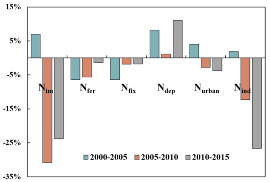Variation rates of N input sources during 2000–2005, 2005–2010, and 2010–2015. Nim = Net food and feed N import, Nfer = Fertilizer N application, Nfix = Biological N fixation, Ndep = Atmosphere N deposition, Nurban = Urban N discharge, and Nind = Industrial N discharge.