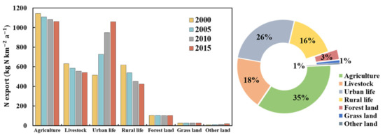 On the contrary, the amount of N exported from urban life, the second main source, showed a significant increasing trend, rising about 106% from 2000 to 2015. This is due to the rapid increase in urban population—more specifically, the number of urban residents in 2015 was about twice as many as in 2000. The N exported from both rural life and livestock breeding showed a decreasing trend from 2000 to 2015, in which the trend of rural life was more obvious. Forest land, grass land, and other land-use types remained relatively stable during the study period. Overall, changes in N exports were inextricably linked to urbanization, as well as the intensification of agriculture and aquaculture.