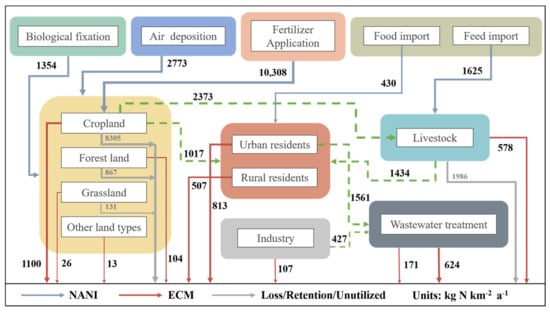 Notably, several assumptions were made to generate this diagram (Figure 7), including that (1) we assumed that each node (i.e., crops, humans, livestock, etc.) was subjected to the conservation of mass; (2) the N produced by local crops and animals were assumed to be completely used to meet the demands of local human consumption and livestock breeding; (3) according to the difference in N demand between people and animals, we assumed that 70% of the crop production N flowed to livestock, while 30% was supplied to humans; (4) the percentage of sewage effluent that was treated by sewage plants was assumed to be 80% based on a multi-year average.