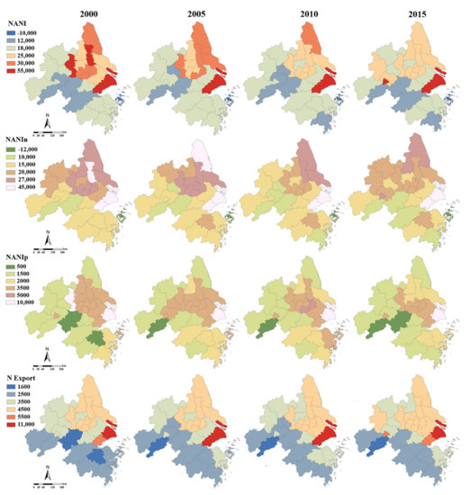 The dynamic spatial distribution pattern of N budgets is shown in Figure 8. The overall distribution of the NANI presented a similar spatial pattern to that of non-point-source N inputs (NANIn) during 2000–2015, showing that the N inputs were higher in the northeastern plain area than in the southwestern hilly region. It appears that the N inputs were generally high in areas where the population density was high and were low in areas where woodland was the main land-use type.