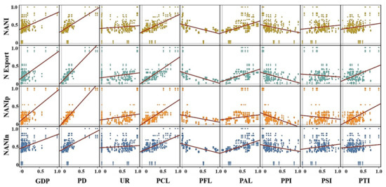 The relationships between human activity indexes and the NANI, N Export, NANIp, and NANIn over the study period. GDP = Gross Domestic Product; PD = Population Density; UR = Urbanization Rate; PCL = Percentage of Construction Land; PEL = Percentage of Forest Land; PAL = Percentage of Agricultural Land; PPI = Proportion of Primary Industry; PSI = Proportion of Secondary Industry; PTI = Proportion of Tertiary Industry.