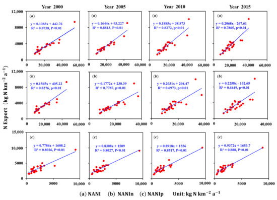 Relationships between the (a) NANI, (b) NANIn, (c) NANIp, and N exports in 2000–2015.