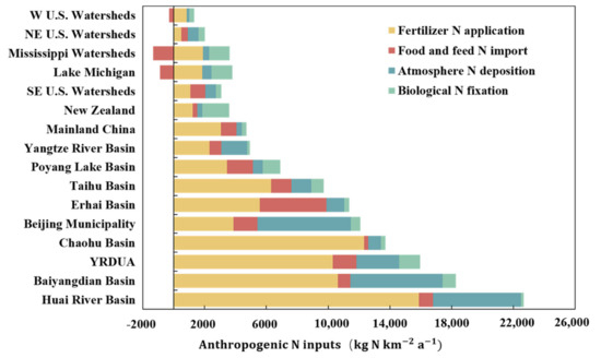 Except for the Huai River Basin (HRB) and Baiyangdian Basin (BYD), the NANIn of the YRDUA was higher than those of the other basins or regions shown in the figure. Fertilizer N application and atmospheric N deposition were the main causes for the relatively high values of the NANIn in these two basins, and this is consistent with the two main sources of the NANI in the YRDUA. Unlike other areas where fertilizer N was the most vital source of N inputs, the atmospheric N deposition was the dominant source in Beijing, which was closely related to the urban characteristics there. This also revealed that fossil fuel combustion could be the main source of N pollution in metropolises.