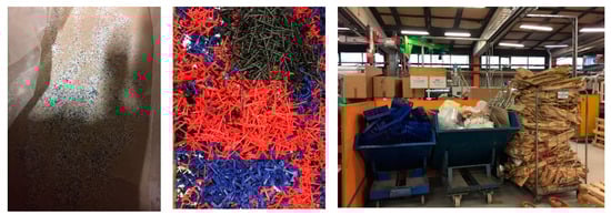Regrind material (left), whole components (middle) and waste sorting facilities (right) of a plastic product manufacturer in the project.