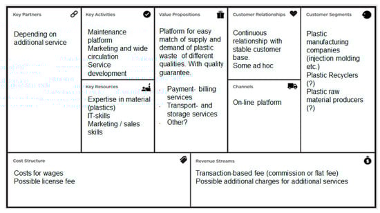 The business model canvas method was deployed in the project as a way of structuring and documenting the work. Since none of the actors in the project could—or would—take on the role as the owner of the on-line marketplace, the BMC results must be seen as a best guess hypothesis to be further developed in an agile process, as suggested by Björkdahl et al. []. Nevertheless, the project has resulted in some important findings regarding a potential business model for an on-line marketplace. The suggested business model is based on a commercial set up, where the platform provider sells its services to the users, i.e., the plastic industry actors. This is an example of a two-sided marketplace suitable for a circular economy [] with active exchange of goods []. In a follow up project focused on the Swedish market, we analyzed a few new marketplaces that appeared in Northwest Europe with a focus on post-industrial plastic waste, and offering additional services including matchmaking and material quality certificates. The follow-up analysis did not contradict the findings of this paper, but rather confirmed them, since much industrial plastic waste is still occurring, which could be prevented by facilitating other actors to (re)use it. An estimate of the amount of the post-industrial plastic waste flows was calculated at 5000 ton per year in Sweden alone []. This indicates that the market has not changed that much and that the potential for redirecting these flows back into the loop still exists, including the application of a new business model by new actors.