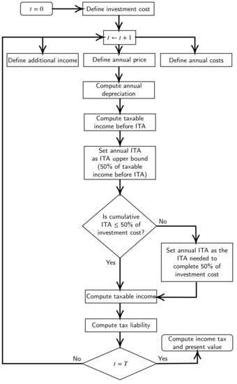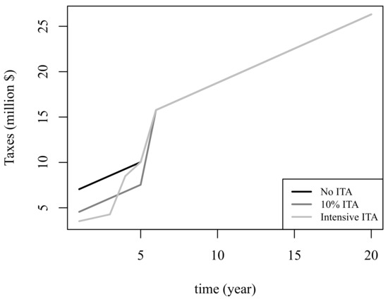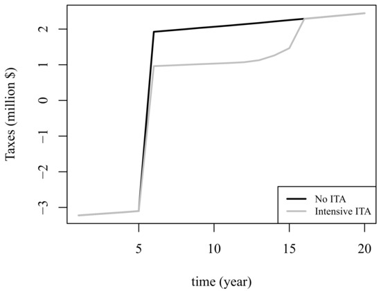 The analysis is developed by illustrating different possible forms of applying ITA. To compute the project’s taxable income , an “intensive” ITA scheme has been designed. This scheme deducts annual taxable income as much as possible. In other words, this ITA scheme is set as the annual upper bound, defined in Equation (3), as long as cumulative ITA falls below $37.8 million (50% of the initial project’s investment cost).