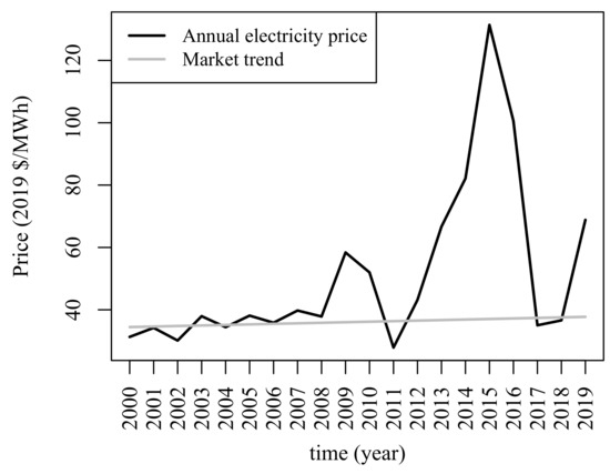 Also, historical price data, originally recorded in nominal COP/kWh, are indexed to 1 January 2020 COP/kWh using the monthly Colombian producer price index reported in [50]. Once historical prices are expressed in 2020 COP/kWh, the average exchange rate of December 2019 (3383 COP/$) is employed to obtain electricity prices in 2020 dollars ($). Figure 2 illustrates historical the behavior of electricity prices in 2020$. Prices in periods 2009–2016 and 2019 are strongly correlated with the Niño phenomenon as explained by [51,52]. Under Niño phenomenon conditions, the level of reservoirs decrease, which in turn yield to potential scarcity of hydro resources, and subsequent lower hydro production. As a result, the market reaction becomes evident as market price tends to increase due to intensive use of expensive non-hydro technologies [53]. By neglecting the Niño phenomenon intervention on price, a linear trend of price was obtained. The resulting equation is $/MWh, . This represents 0.44% of annual growth in average in the 2000–2019 period. The p-value of the coefficient of the historical price linear trend is 0.291 when Niño phenomenon intervention over price is not considered. In hydro-dominated countries like Colombia, hydropower plants tend to offer every unit of energy at higher prices under scarcity of hydro resources. Thus, if Niño phenomenon data are included in the analysis, the p-value of the linear trend becomes 0.013. That is, price tends to increase over time.