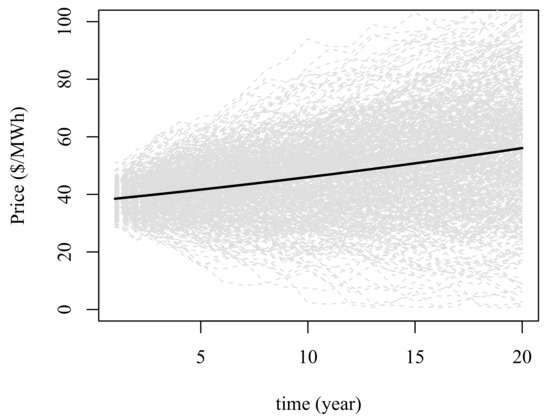 where error terms are i.i.d. and represents unbiased normal perturbations. This analysis has been constructed employing and . corresponds to the average price of year 2019 equal to 37.73 $/MWh. When standard deviation of electricity price at year 1 (parameter ) is significantly high (generally above ), year-20 prices might become negative although with low probability. This situation would be unrealistic. In addition, considering to be around guarantees random prices can be high enough to capture potential price spikes due to Niño phenomenon as Figure 3 illustrates. Figure 3 shows 500 realizations of prices under approach. The trajectory of expected price, given by , is represented by the solid black line. It basically displays a 2% annual increase on average and is defined by . According to the random trajectories, it is also noticeable price variance, modeled through Var increases over time. Theorem A1 and Corollary A1 in Appendix A present the theoretical development of the parameters of electricity price distribution.