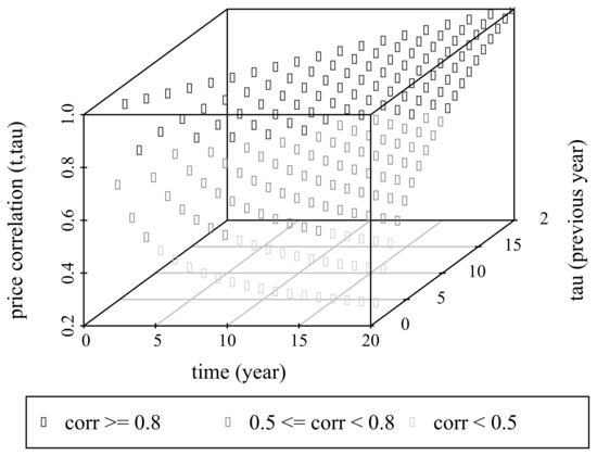 As expected, . In fact, the smallest correlation observed is , which does not suggest linear statistical relationship among such prices. However, highest correlations occur as long as time evolves according to Figure 4.
